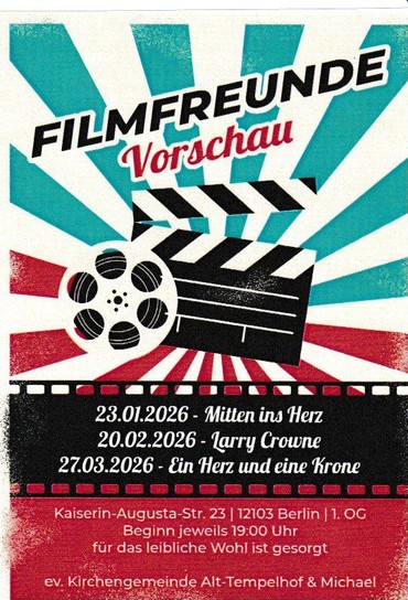 Filmfreunde, Vorschau für Januar-März 2026, 19 Uhr, Gemeindehaus, Kaiserin-Augusta-Str. 23, 12103 Berlin